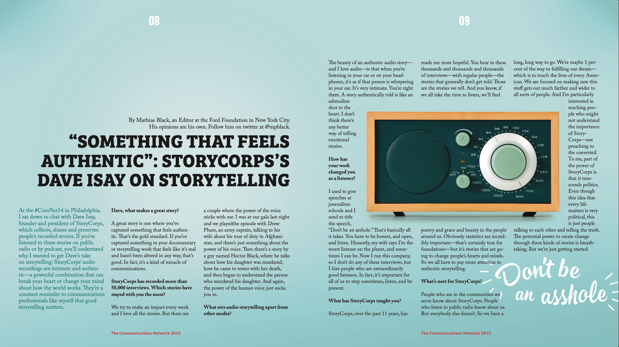This interview with Dave Isay, radio broadcaster and founder of StoryCorps, for the Communications Network is a small example of my extensive experience doing journalist-style interviews with high-profile experts.